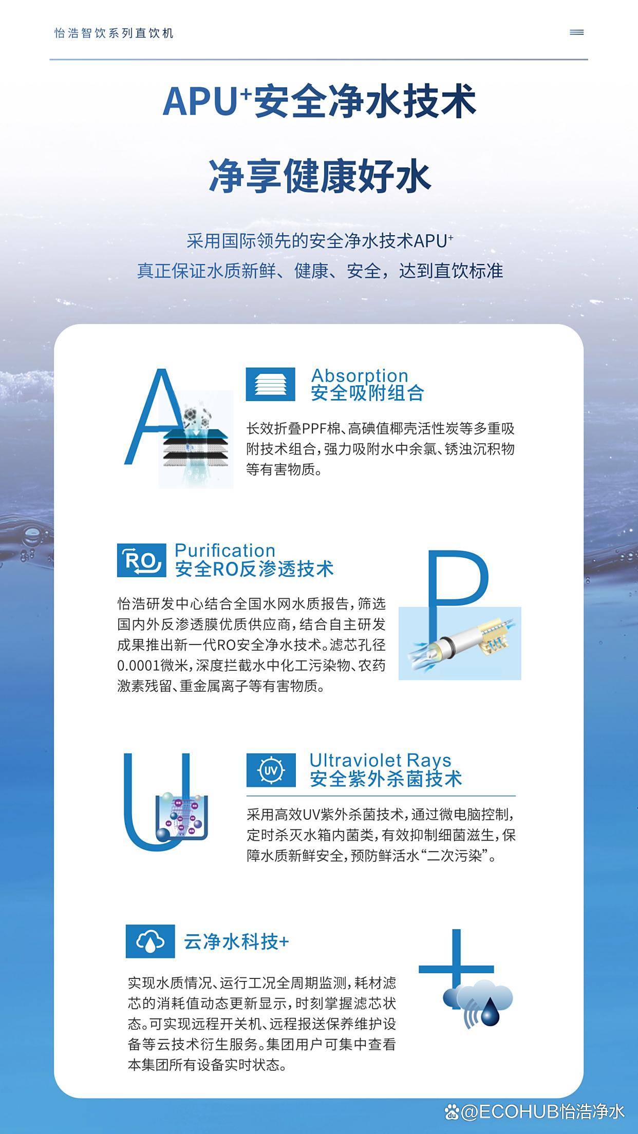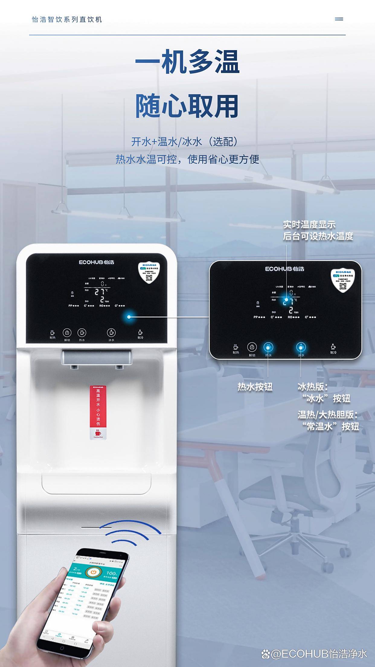 在企业办公环境中,饮水安全与供应效率往往直接影响员工的健康与工作体验。会议间隙的高峰用水、前台与培训区的稳定供水、以及远程监控与维护成本,都是企业需要解决的现实痛点。传统设备常常出现水质波动、用水速度慢、温控不稳定,以及现场维护繁琐的问题。怡浩品牌带来智尊系列直饮机,以物联网系统为核心,结合五级反渗透过滤和高效制水路径,帮助企业实现远程水质监测、设备状态实时掌控,以及灵活的用水管理。其纳米涂层304不锈钢机身、浸入式LED紫外杀菌、步进式加热等设计,为办公场景提供稳定、安全的饮水解决方案。