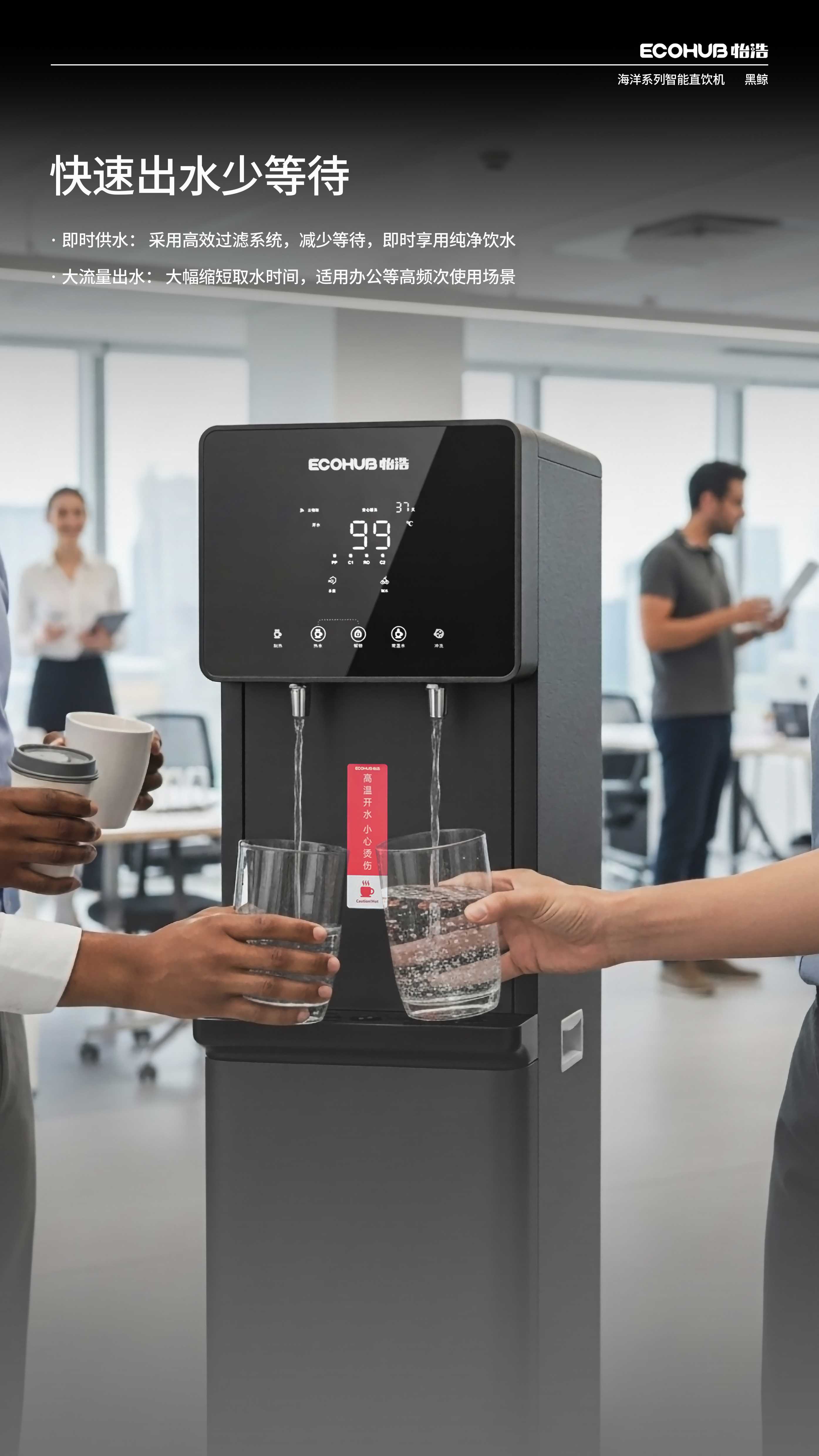 怡浩黑鲸直饮机专为企业、办公、教育等场景量身打造,以“技术硬核+服务省心”为核心优势,核心亮点如下: